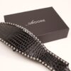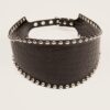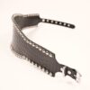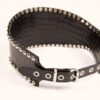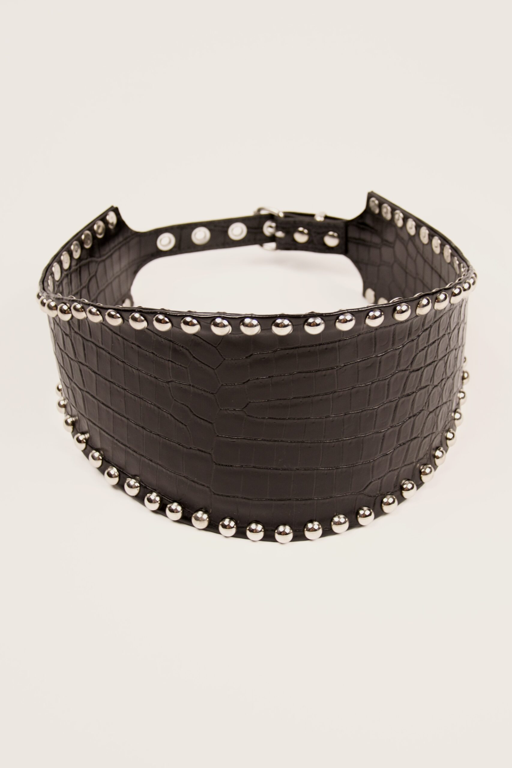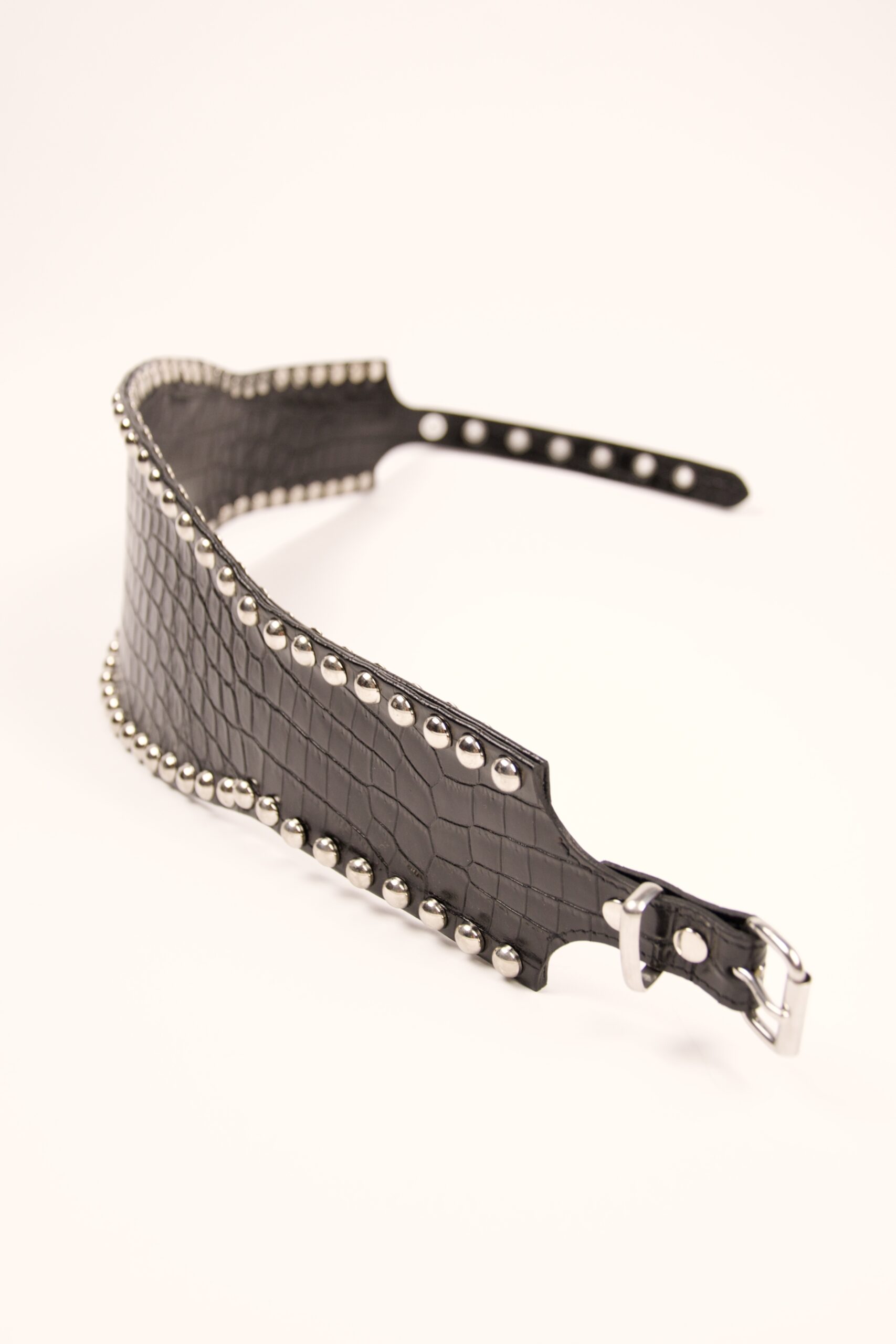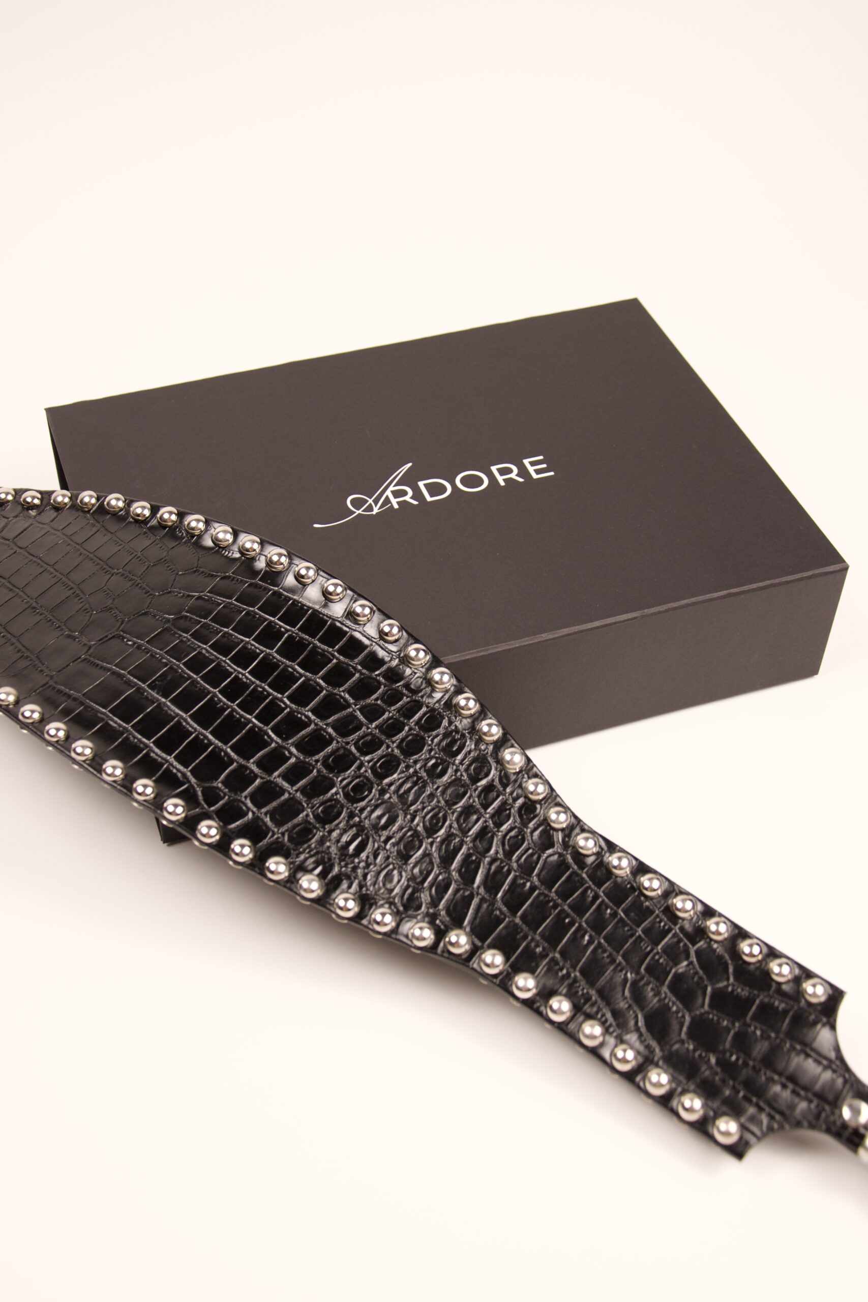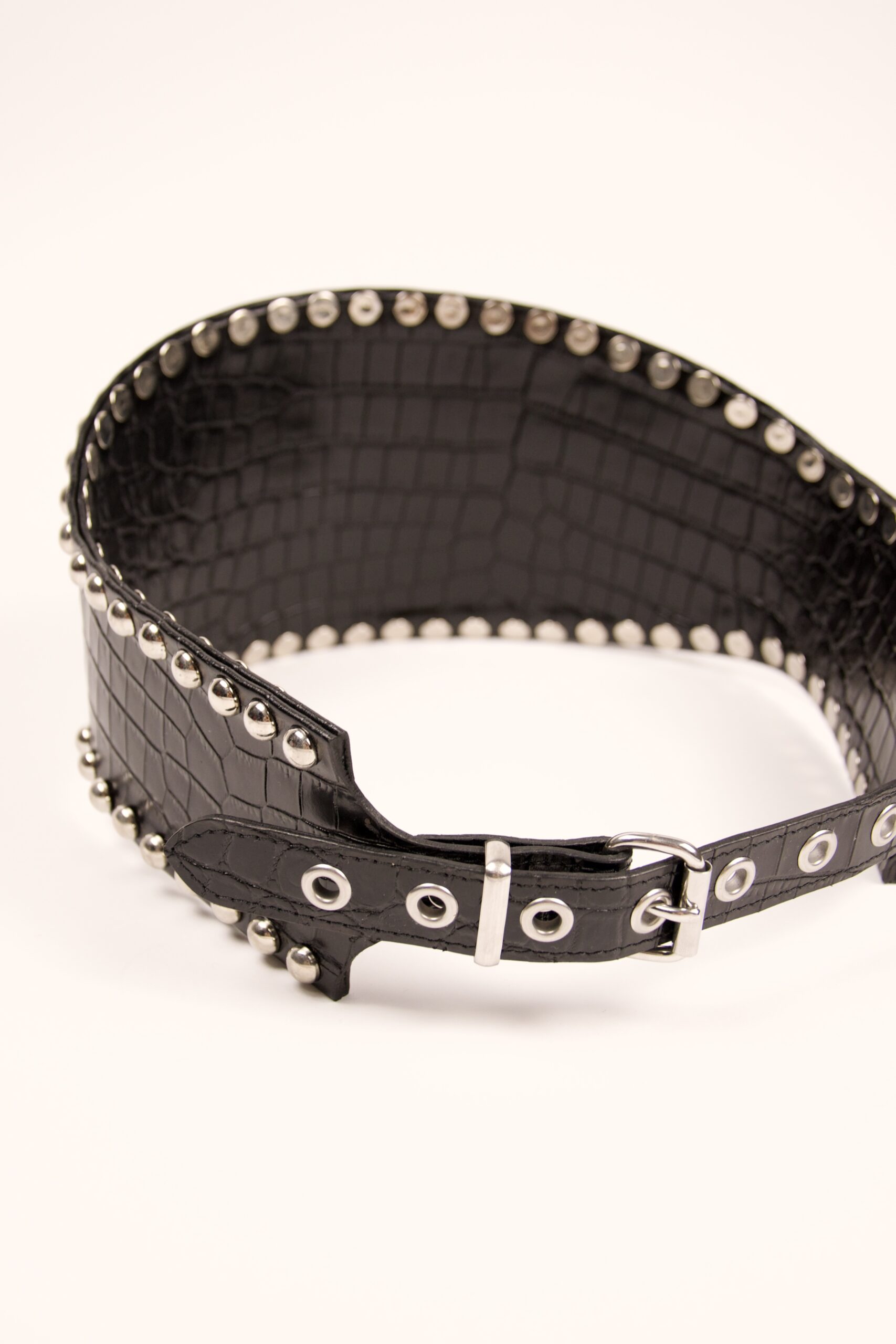 The narrow belt is crafted from premium black croc-embossed Italian leather. Designed with a single adjustable strap, it is adorned with stainless steel rivets.