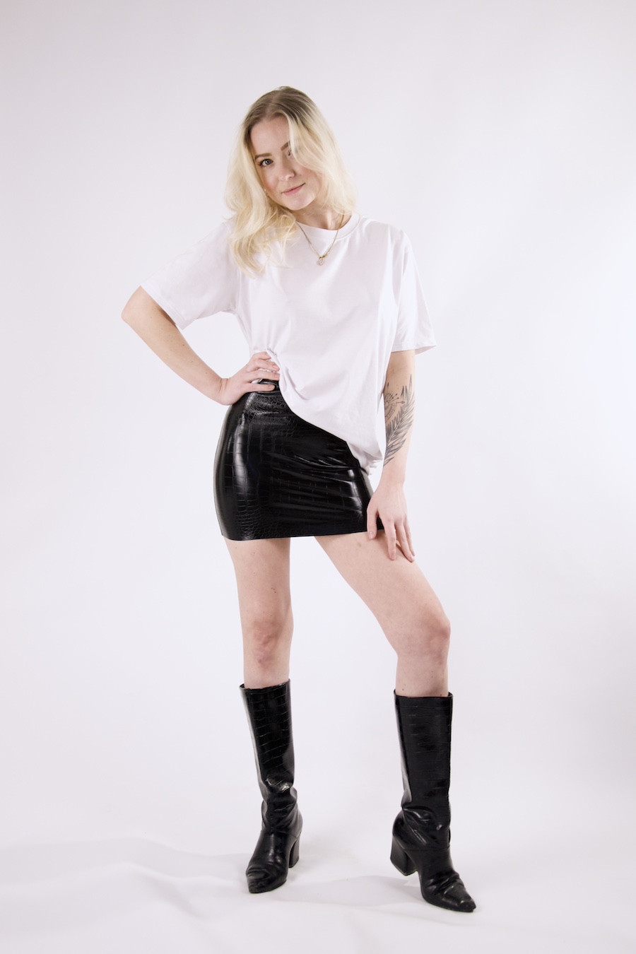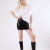 The mini skirt comes in the classical cut with a croc-embossed latex. It is tight-fitting and can be worn both high waisted and low waisted.