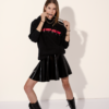 The short latex skater skirt sits high on the waist with a waistband and creates a defined A-line with its pleats.