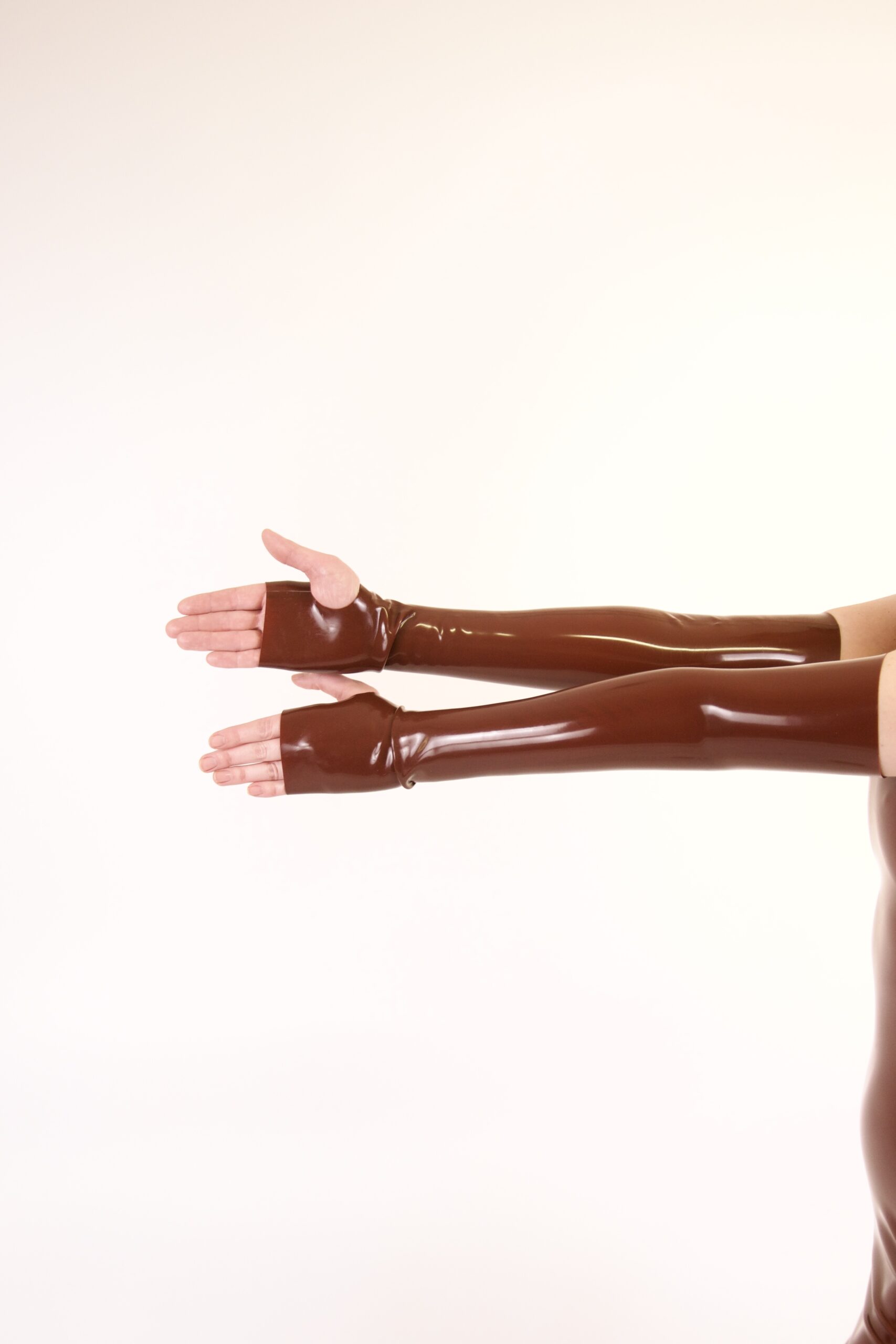 The long latex gloves reach up to the middle of the upper arm, offering a snug fit. The open-finger design leaves the upper parts exposed, while a separate thumb hole ensures a secure and comfortable wear.