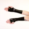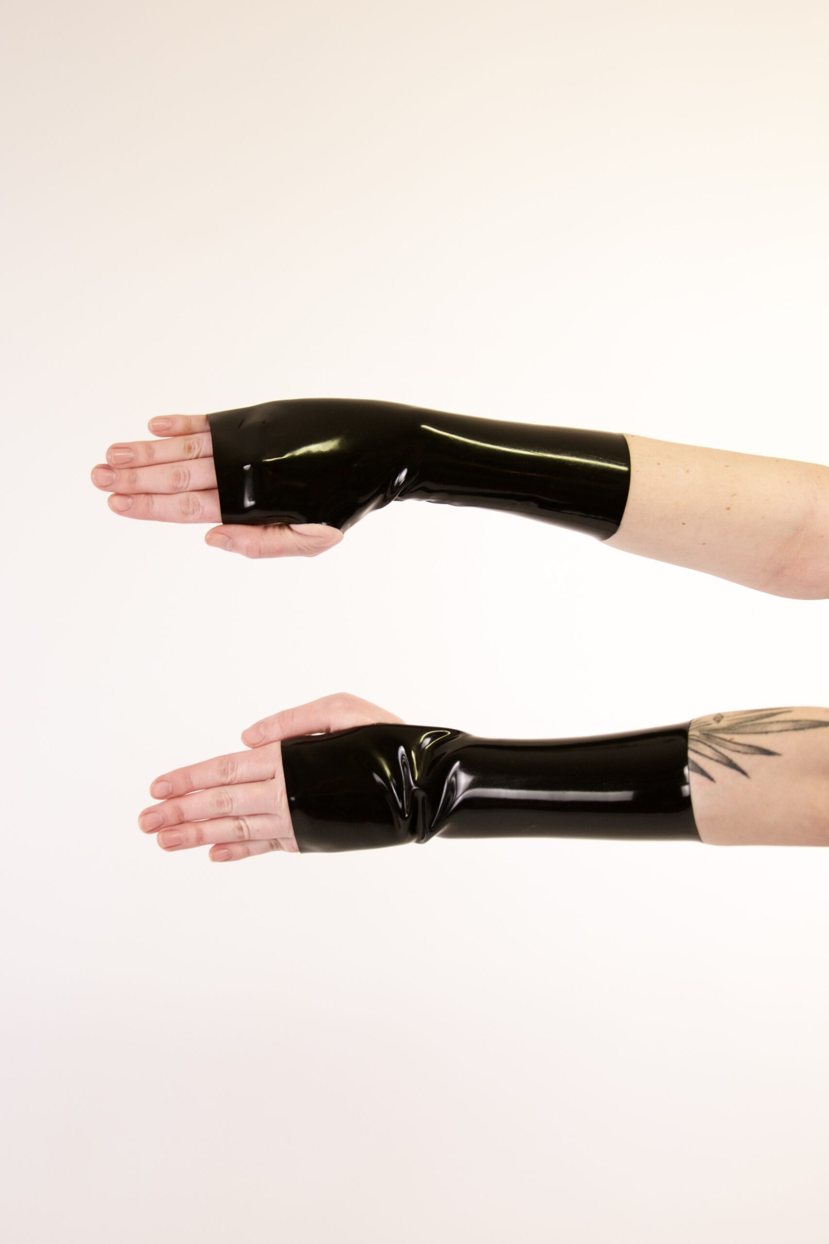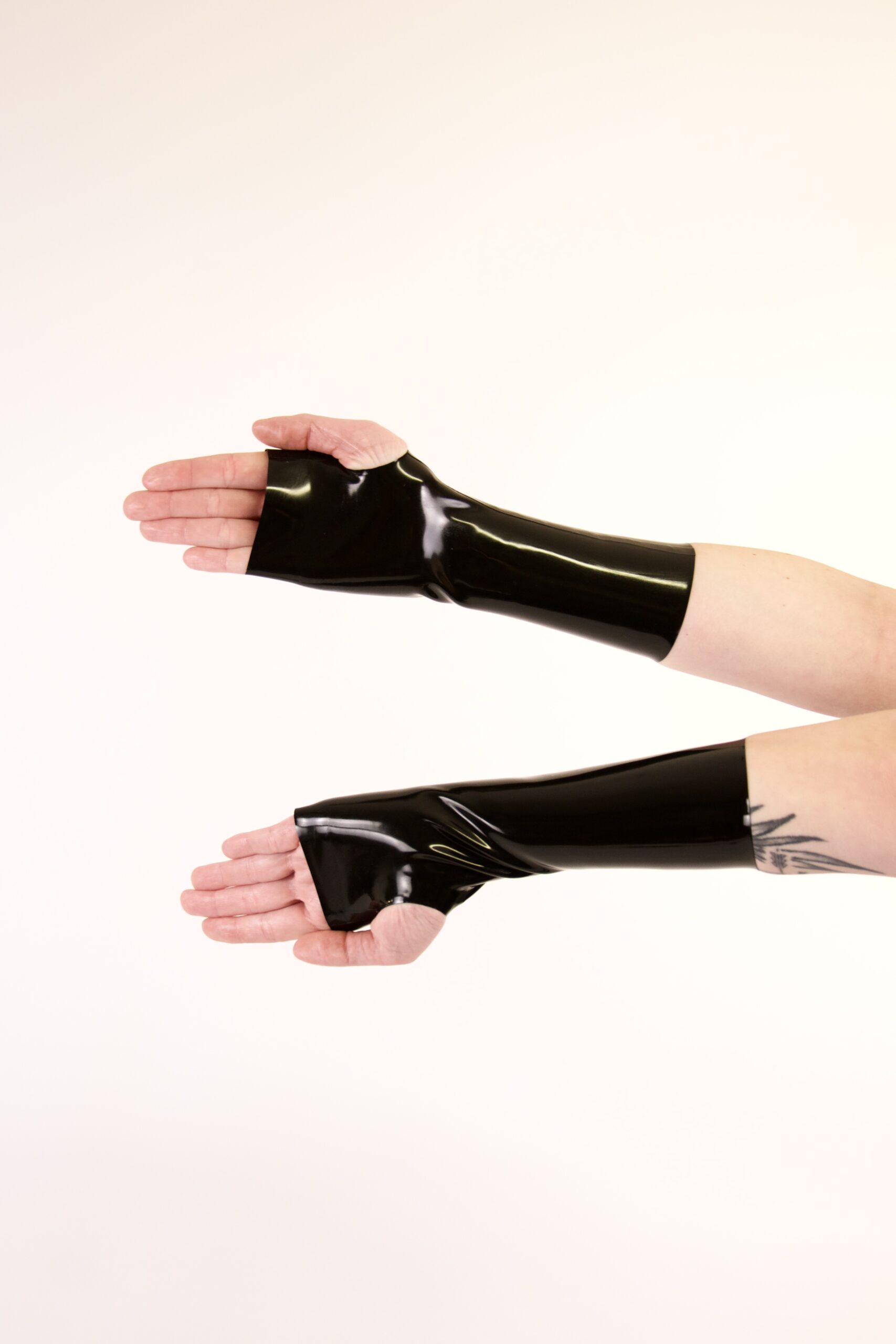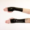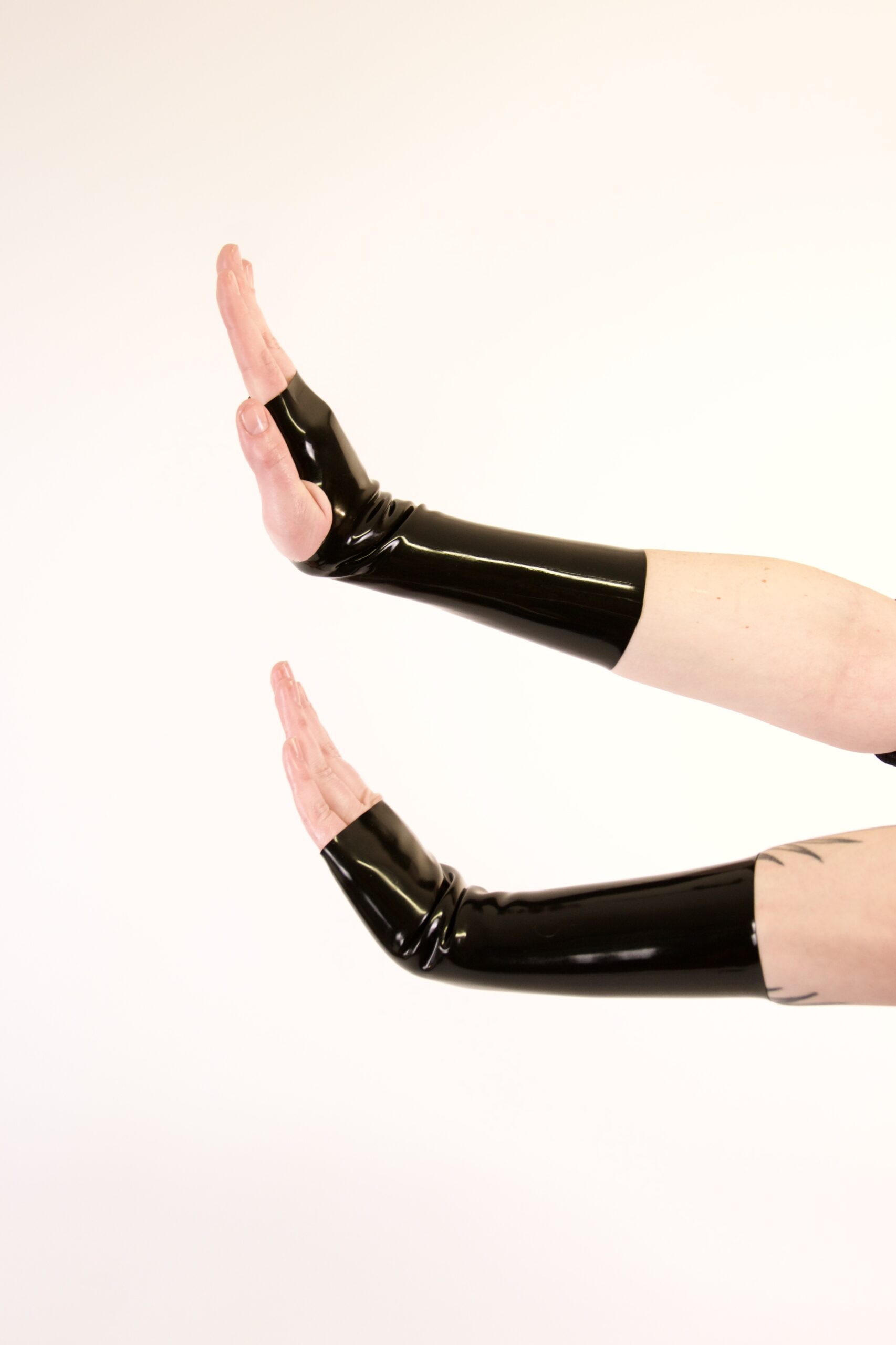 The mid-length latex gloves extend to the middle of the forearm and have a tight fit. The fingers are about half open, leaving the upper parts free. A separate hole for the thumb ensures a secure fit.